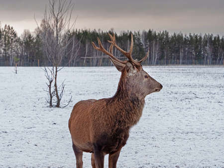A deer standing in a field in winter. Young deer with beautiful antlers.