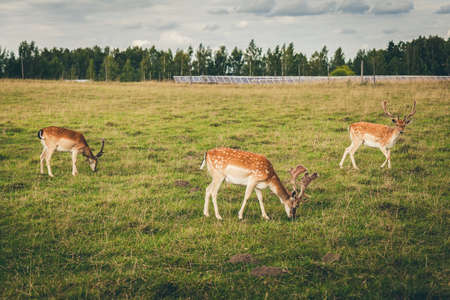 A herd of European fallow deer in a meadow in front of the forest. Wildlife