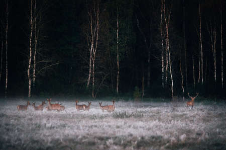 Red deer leader and herd against misty forest early in the morning during the rut in Belarus