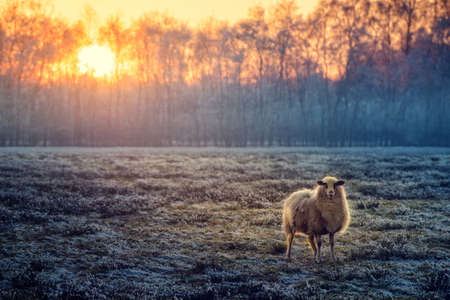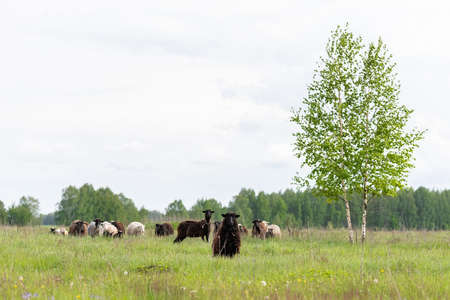 a herd of rams graze outside in the grass in the meadow. selective focus