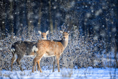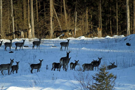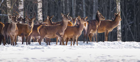 Herd of deer of different ages in the forest in winter