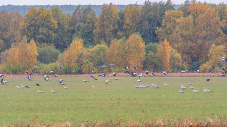 Huge flock of cranes in an early autumn morning in a plowed field. Common cranes (Grus grus) dancing in a farm field in late October during the migration south