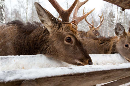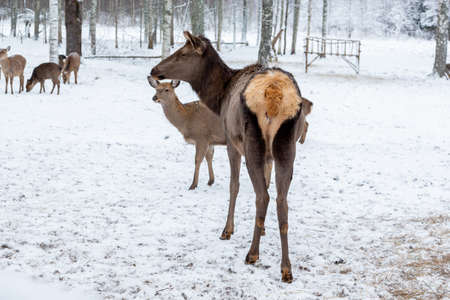 Herd of wild Red deer in winter forest. wildlife, Protection of Nature. Raising deer in their natural environment.
