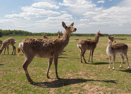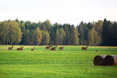 Flock of deer in the meadow in the wild