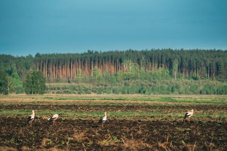 Group Of Adult European White Storks Ciconia Ciconia Standing In Field In Belarus. Wild Field Birds.