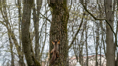 Red squirrel looking down from a tree in spring with copy space.