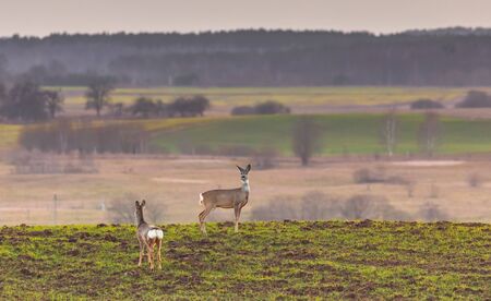Two roe deers on a mound in the spring background