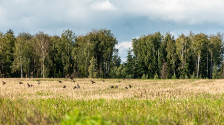 a flock of migrating birds on a cultivated crop field, autumn
