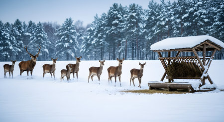 A herd of red deer, including a large stag with prominent antlers, stands in a snowy, winter landscape with a pine forest in the background. The deer are gathered near a wooden hay feeder, suggesting a cold season and a need for supplemental food. The scene conveys themes of wildlife, nature, and survival during winter.