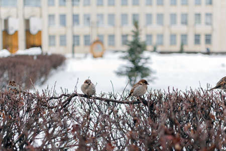 A flock of sparrows on winter bushes in a city park