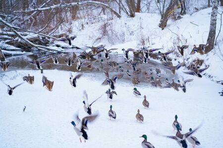 A flock of ducks are swimming in the water in winter
