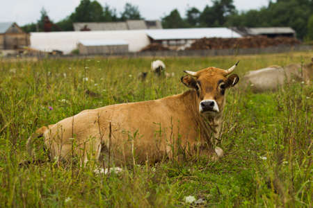 The cow grazes in the meadow in summer time