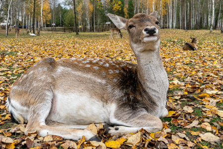 spotted deer doe lies on autumn fallen leaves.
