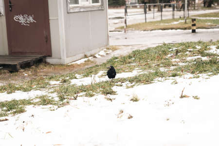 Black raven on the white snowy field green grass under snow