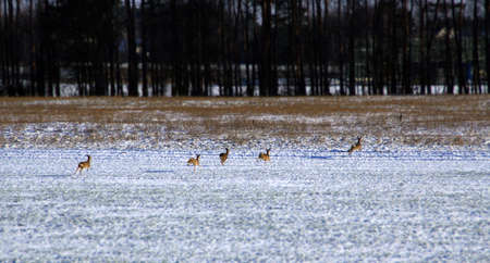 A herd of deer runs across the field. Wild animals during the winter season.