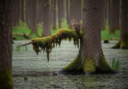 Owl sitting on a tree branch in a swamp with moss.