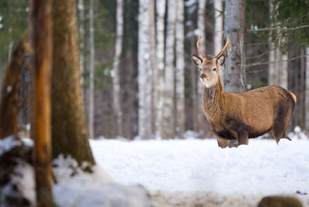 Red deer in winter forest looking to camera. wildlife, Protection of Nature. Cervus elaphus in cold winter day