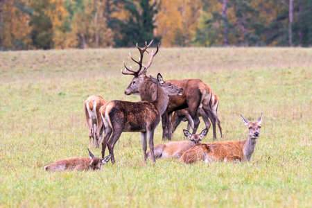 A herd of young deer is resting in the meadow. Autumn