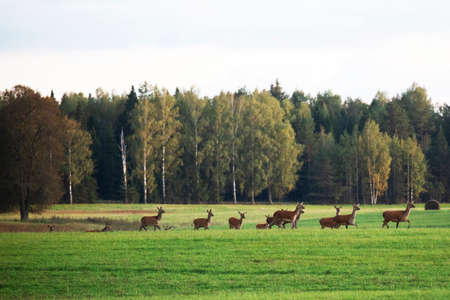 autumn idyll. A herd of deers goes through the meadow into the forest