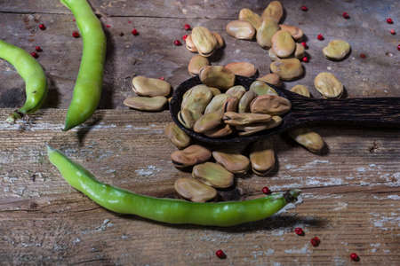 Fresh broad beans on a wooden table in the garden. Selective focus.