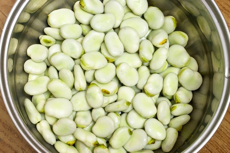 Close up and background of green broad beans (Vicia faba) lying in a bowl. One pod is still whole.