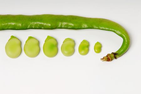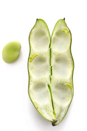 Vicia faba vegetable on white background. Its other names broad bean, fava bean, or faba bean. It is a species of vetch. This a flowering plant in the pea and bean family Fabaceae