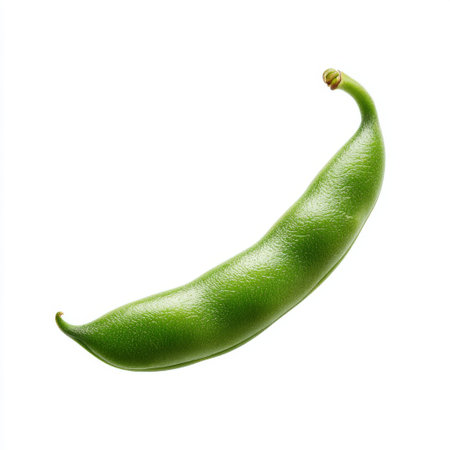 A detailed close-up photo of a single fresh green bean featuring a smooth texture and vibrant green color, perfect for culinary and health-related projects.