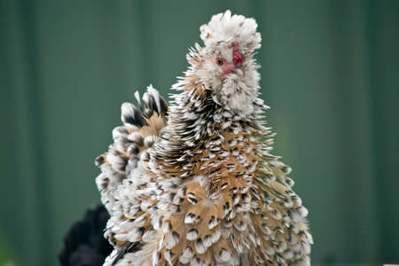 Portrait of white-brown-gray Brahma hen on the farm. Photography of nature and wildlife.