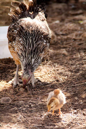 Free range chickens roam the yard on a farm. Chickens on traditional free range poultry farm. Livestock, Rural life.