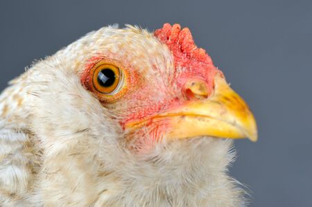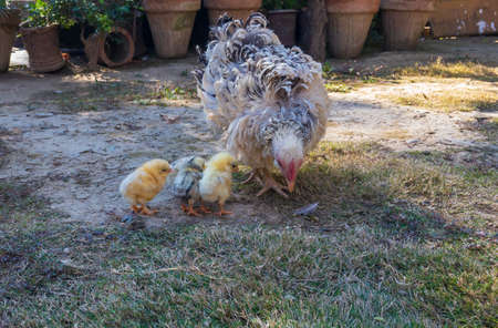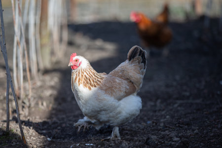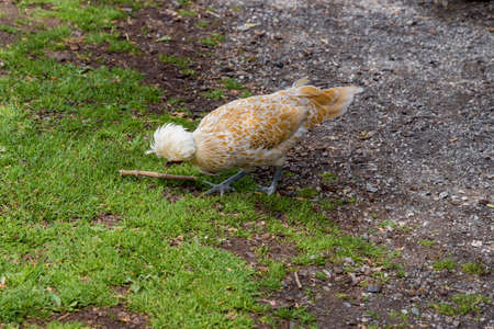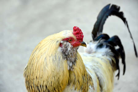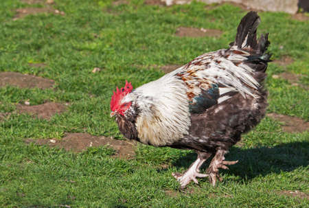 Ornithology, agriculture, homeste animals concept. Beautiful colorful chicken hen closeup walking outside.
