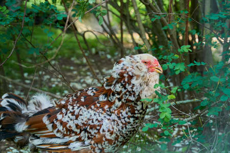 Chicken Russian Orloff chicken breed stands in the bushes and looks to the camera.Close-up