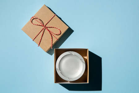 Blue gift box on blue background. top view