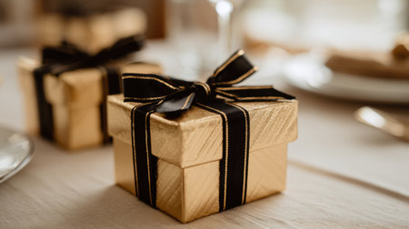 Gold gift boxes adorned with black ribbons are arranged on a beautifully set dining table, creating a festive atmosphere for a celebration or gathering.