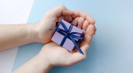 Purple gift box with blue bow in male hands on light blue background. Top view. Copy space.