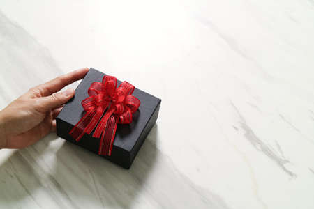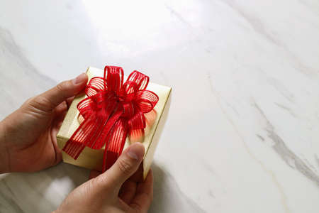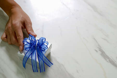 gift giving,man hand holding a gift box in a gesture of giving on white gray marble table background