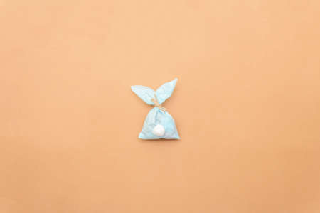 Easter bunny paper gift egg wrapping DIY idea on colorful background. Minimal easter concept, flat lay, copy space