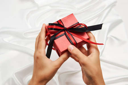 Female hands holding small gift box with ribbon on white background. Christmas, New Year, Valentine's day and birthday concept