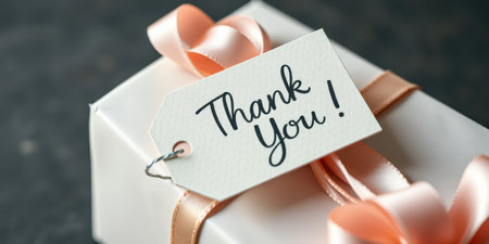 Gift box with a thank you tag and pink ribbon on a dark surface for appreciation moments