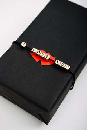 Valentines Day gift wrapping, package. Valentines Day gift background with black craft gift box with text I Love you and two red paper hearts.