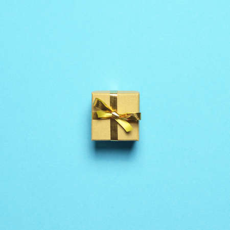 Christmas gift with golden ribbon on pastel blue background