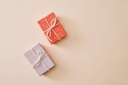 Flatlay with gifts in wrapped boxes top view on pastel color background