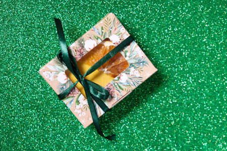 Handmade soap in festive packaging on a shiny green background.