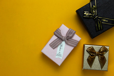 Three Gift Boxes, pink, black, and golden are isolated on yellow background. Used in giving present concepts designs.