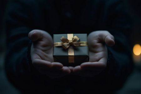 Close up of a person holding a small gift box with a golden ribbon, offering it in a dimly lit setting