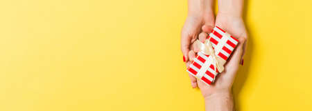 Top view of a man and a woman congratulating each other with a gift on colorful background. Surprise for a holiday concept. Close up.