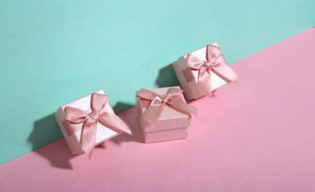 Gift boxes on blue-pink background. minimalism. trendy shadow. creative layout.