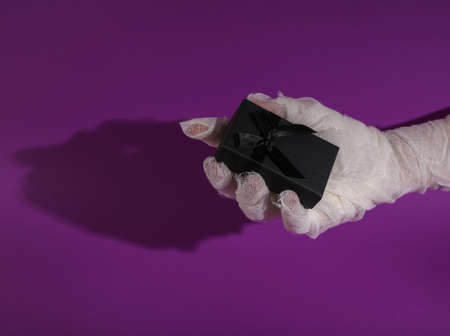 Mummy's hand holds black gift box on purple background with shadow. happy halloween