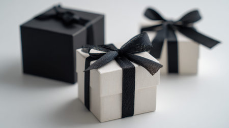 Three stylish gift boxes featuring sleek black ribbons create an inviting atmosphere for any celebration, enhancing your special moments with elegance and charm.