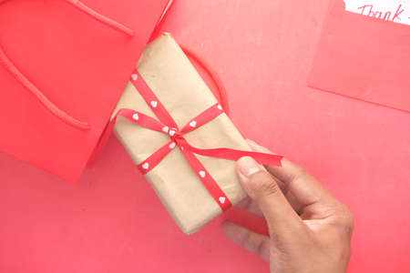 Graft gift box on red background. Paper present box. Top view