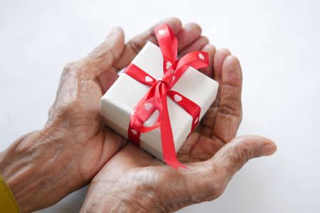 senior women hand hold homemade gift box on white